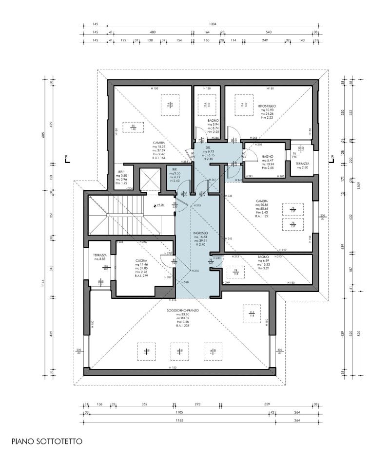 Appartamento di oltre 250mq che si manifesta come un luogo aperto, luminoso ma intimo, filtrato dal mondo esterno. Dall’esterno è un qualcosa di inaspettato. Le travi a vista bianche, in contrasto con il colore brunito della struttura in acciaio, dominano gli ambienti, riflettendo la luce degli ampi velux e creando dei divertenti giochi con ombre. All’interno trovano spazio tre ampie camere da letto tre bagni di cui uno ad uso lavanderia, un ampio soggiorno e la cucina. Le due terrazze sono ricavate come naturale proseguimento degli interni che si fondono così con l’ambiente esterno ed il cielo di Padova.